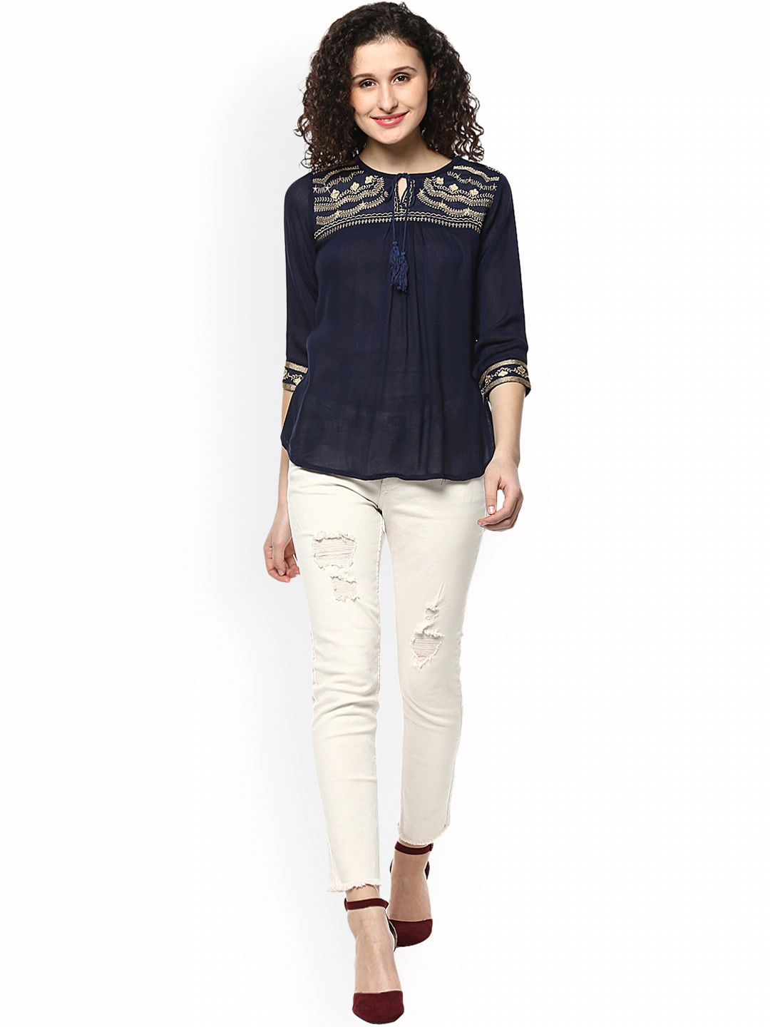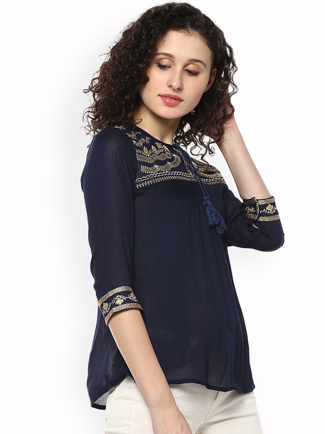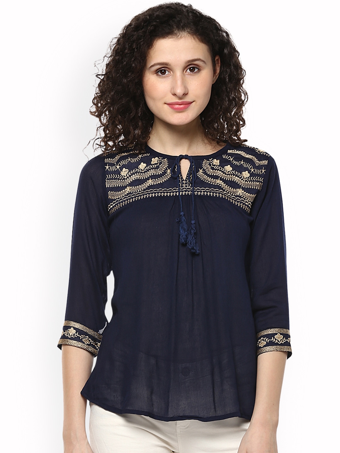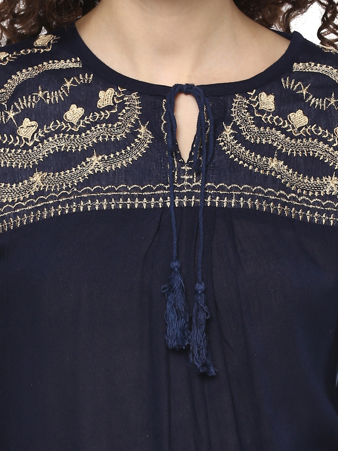 Navy Blue embroidered woven regular top, has a tie-up neck, three-quarter sleeves